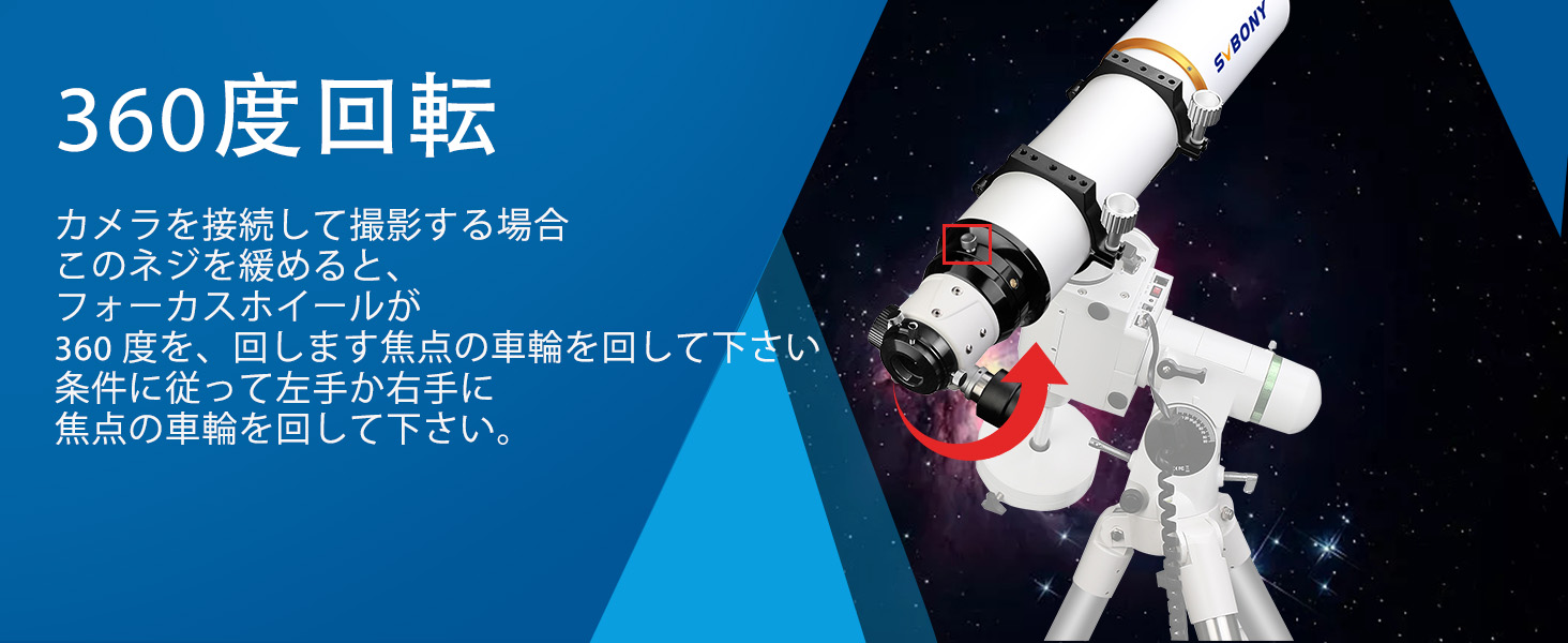 本体に採用されているデュアルフォーカサーは減速比1:10で、微細なフォーカス合わせが出来ます。また、接眼部の繰り出しは精密ラック&ピニオン方式で、重量のある機材を装着した際の緩みやズレを防止出来ます。更に、接眼部全体を回転させる回転機能があります。この回転機能を使えばファインダーを見やすい場所に移動・調整可能で、天体写真撮影の際の縦横の切替がよりスムーズに出来るようになります。アダプターは2インチスリーブと1.25インチスリーブの変換アダプタ2個が付属します。