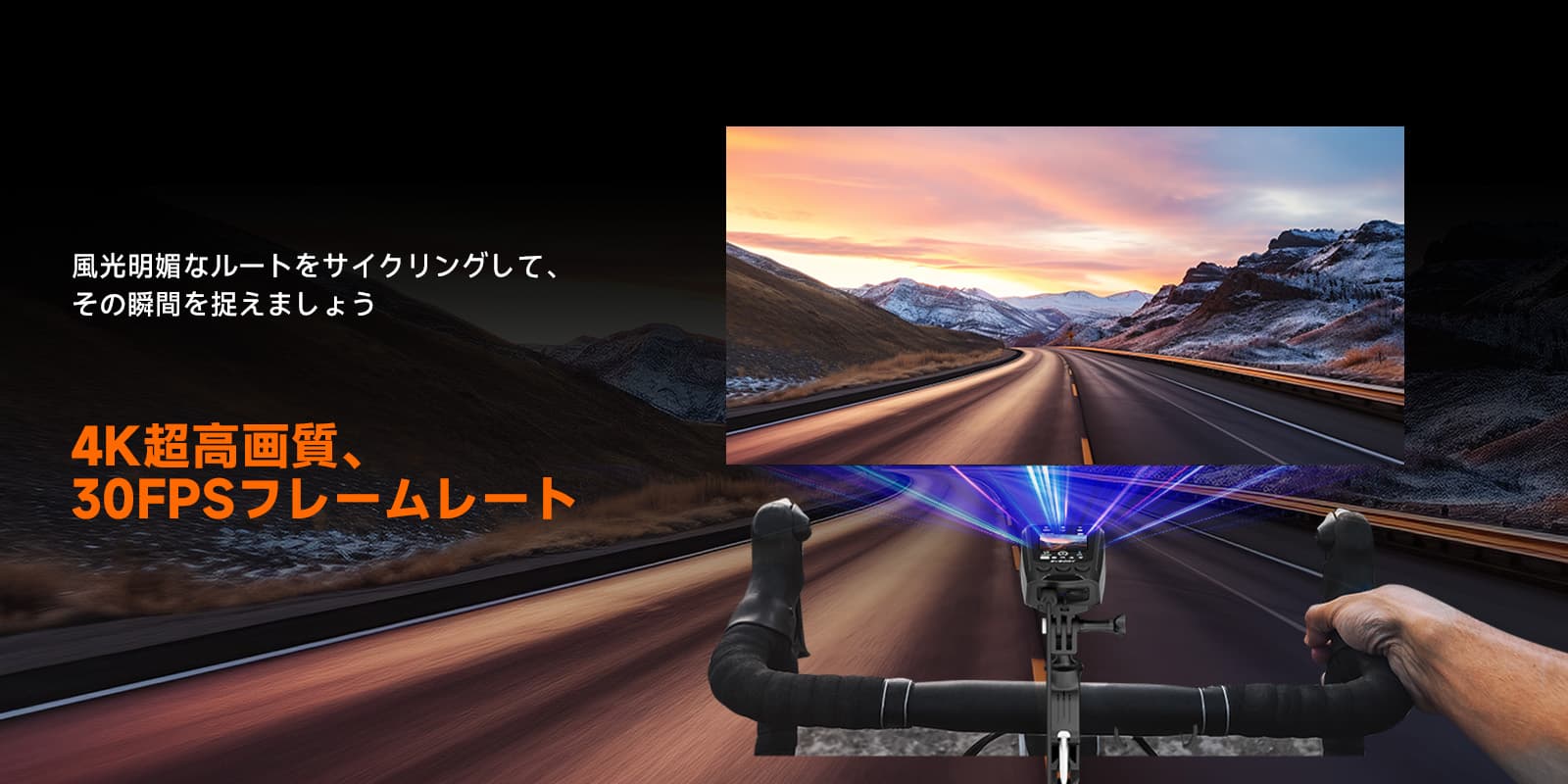 高解像度。無限の世界を探索し、素晴らしいものを記録します。4Kスポーツカメラで高解像度で撮影。スムーズな30FPSのフレームレートを楽しみ、ライドのあらゆる瞬間を止め、サイクリングアドベンチャーのあらゆる詳細を捉えます。