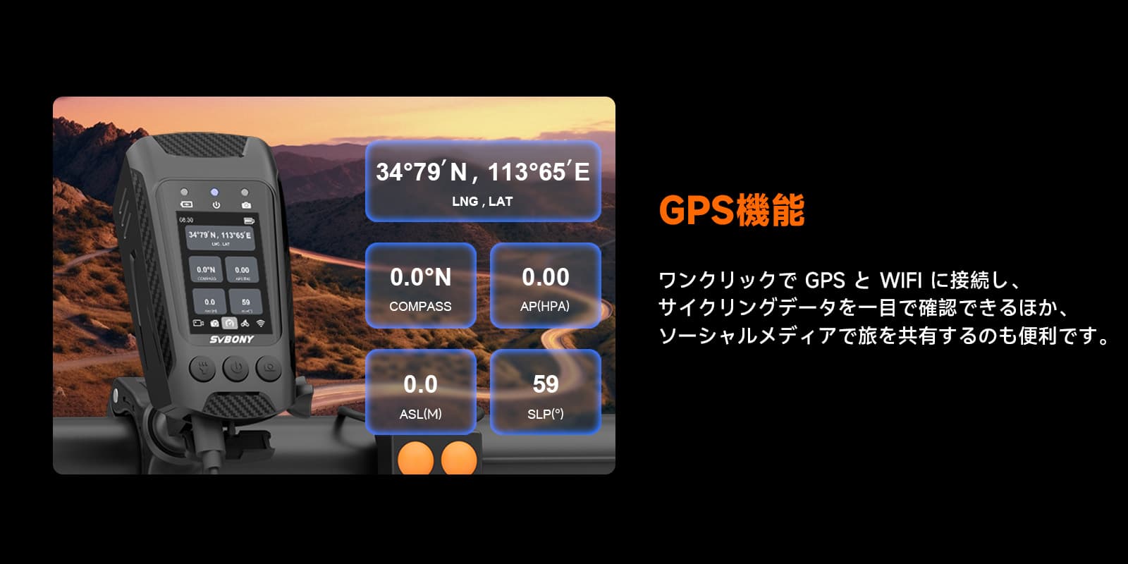 GPS機能:アクションカメラはGPS計器データを統合し、緯度、経度、高度、コンパスの方向、気圧などの重要な情報を見ることができます。