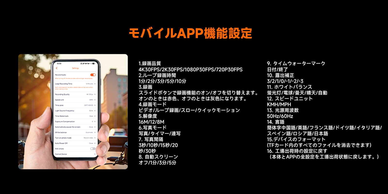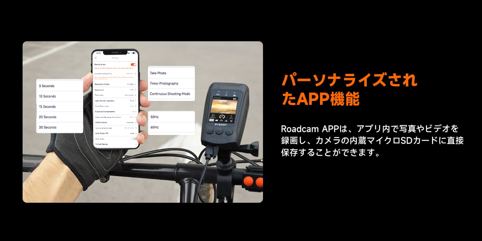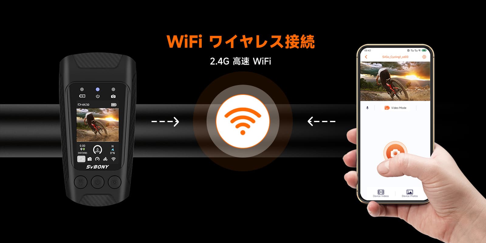WIFI 接続; 2.4GHz 高速 Wi-Fi テクノロジーは、サイクリング愛好家に多くの利便性をもたらします。このアクション カメラの安定した信号と高速伝送速度により、サイクリング中の素晴らしい瞬間を即座にキャプチャして共有できます