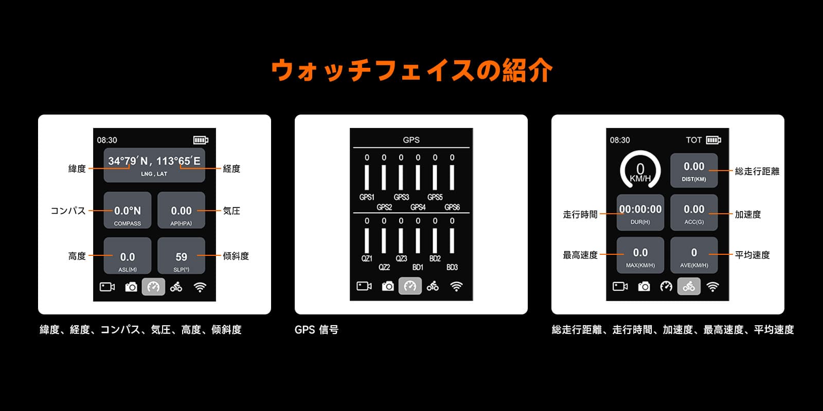 8、GPS機能を搭載するので、経路、緯度、経度、高度、コンパスの方向、気圧、日付などの重要な情報も記録するこができます。