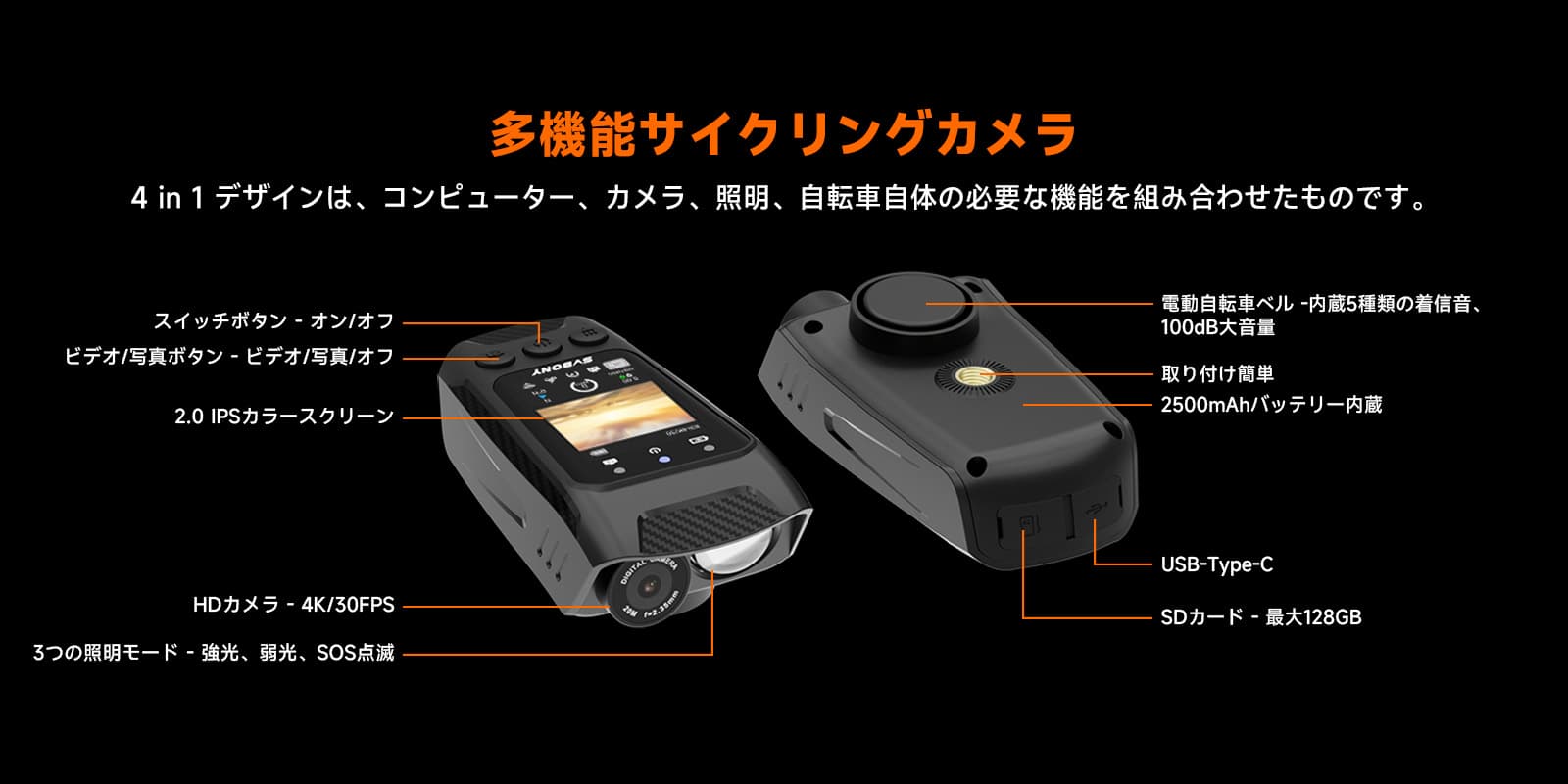 スピーカー機能 30FPS 4Kビデオ 写真 サイクリング旅行 キャンプ旅行 アウトドアアクティビティ