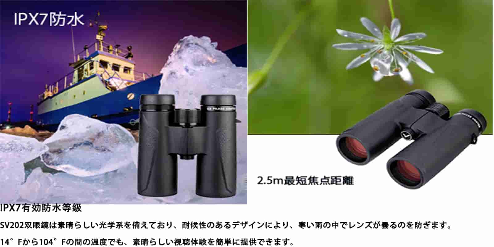 SV202双眼鏡は全面にマルチコーティングを採用した、まぶしさやゴーストを抑え、光の透過率が高いため、より明るく鮮明な視界が得られます。高屈折率BAK4プリズムの採用により、優れた光透過率を確保して色収差を最小限に抑えます。