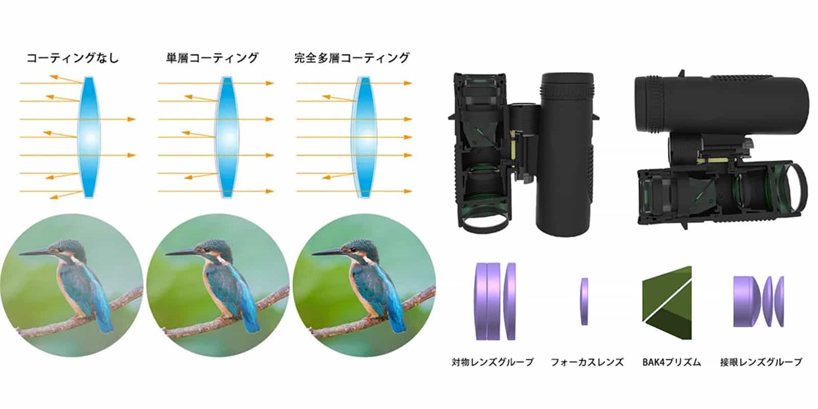 光学系は、3枚の対物レンズ、フォーカスレンズ、BaK4プリズム、および4枚3組の接眼レンズを使用しています。 通常の双眼鏡対物レンズは2枚構成ですが、3枚化により収差を減らして画質を向上させることができます。