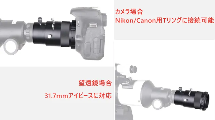 31.7mm径アイピースをリレーレンズに用いる拡大撮影用カメラアダプター。二重筒構造によりアイピースとカメラの距離を調整でき、撮影画像の拡大率を自在に変化させることができます。31.7mm及び42mmT2ネジ接眼部に適合し、Tリングを介してカメラボディを装着します。