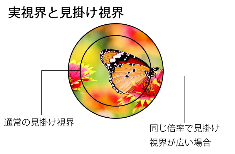 双眼鏡を覗いたときに、ひらけて見える視界の角度のこと。見掛け視界が広いと、高倍率でも実視界が広くなります。