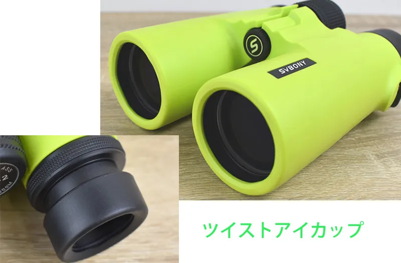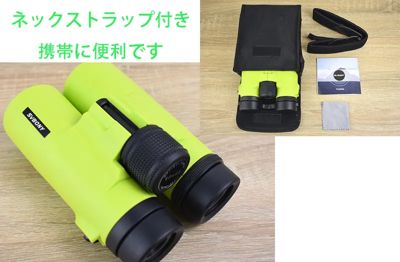 丈夫なケースにしまわれた同商品は、黄緑色が映えるオーソドックスなデザイン。ケースの中には双眼鏡の他、ネックストラップやレンズクリーニングクロスも付属しています。双眼鏡は少し大きめですが、重くもなければ軽くもない印象。ボディは手に馴染みやすく、持ちやすさも良好です。