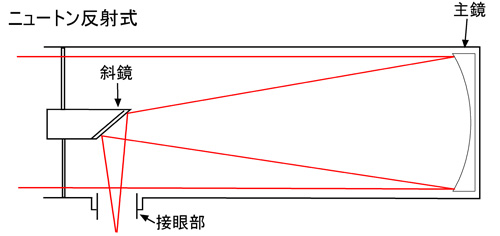 二 、反射式は、下図のように、主鏡と呼ばれる凹面鏡(放物面鏡)で光を集め、 集めた光を鏡筒の開口部近くにある斜鏡(平面鏡)で反射させて、筒外へ光を導きます。 その光を接眼レンズで拡大して、観察するという仕組みになっています。