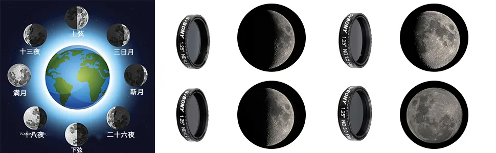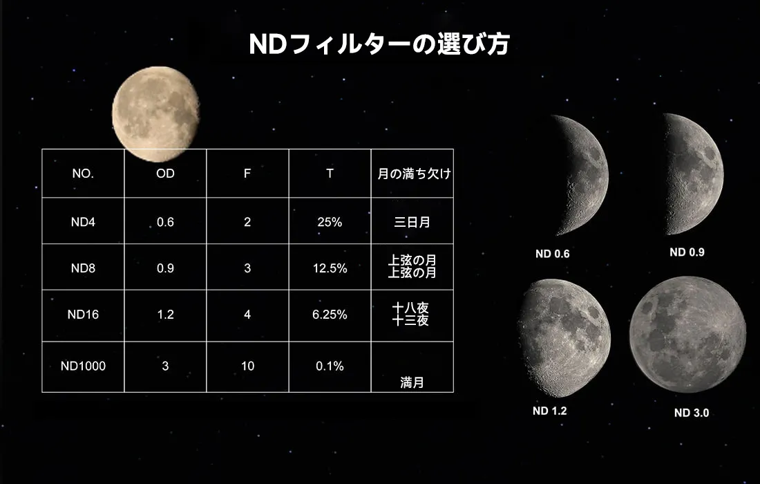 十八夜の場合、透過率6.25%のND16フィルターを使用します。月の照らされた部分が減少することが見られます。 満月後の最初の週でND16フィルターを使用すると非常に良い効果があります。満月時は0.10%の透過率でND1000フィルターを使用して、完全な満月を見ることができます、それは月の最も明るい時にND1000フィルターを使用することは非常に良い効果です。