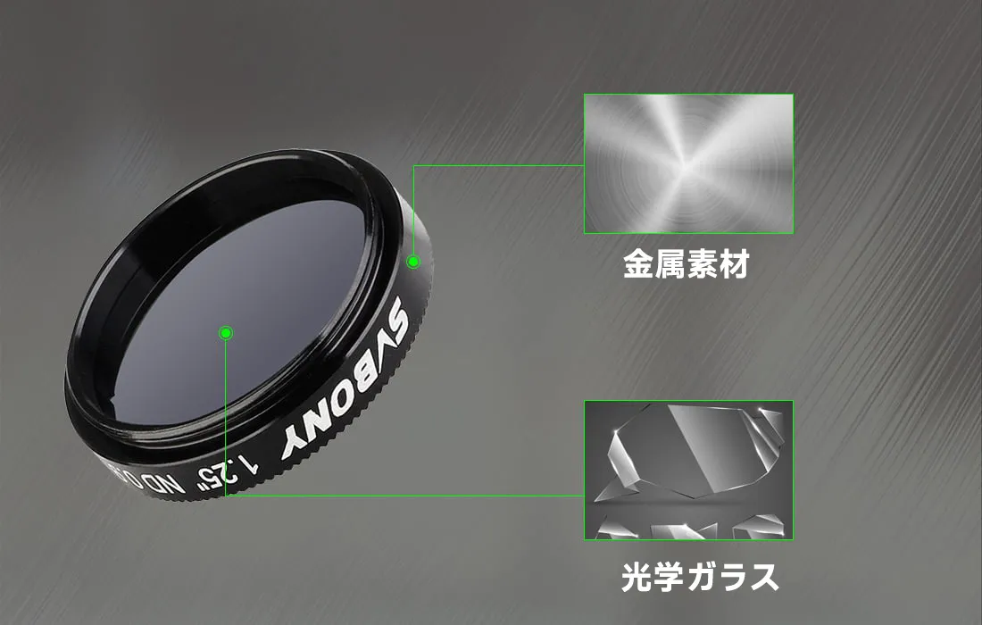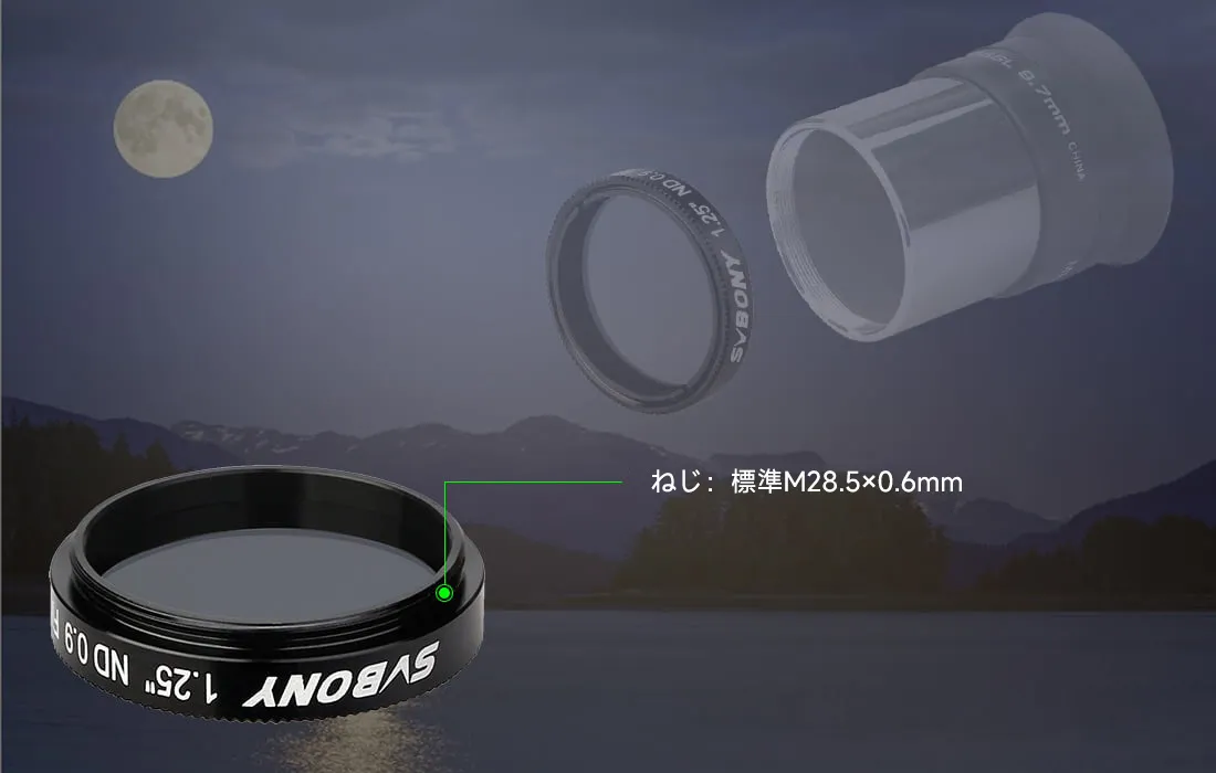 標準の1.25インチのスレッドサイズ。 金属製のフィルターが望遠鏡の接眼レンズの1.25インチバレルに直接ねじ込まれるため、とても便利です