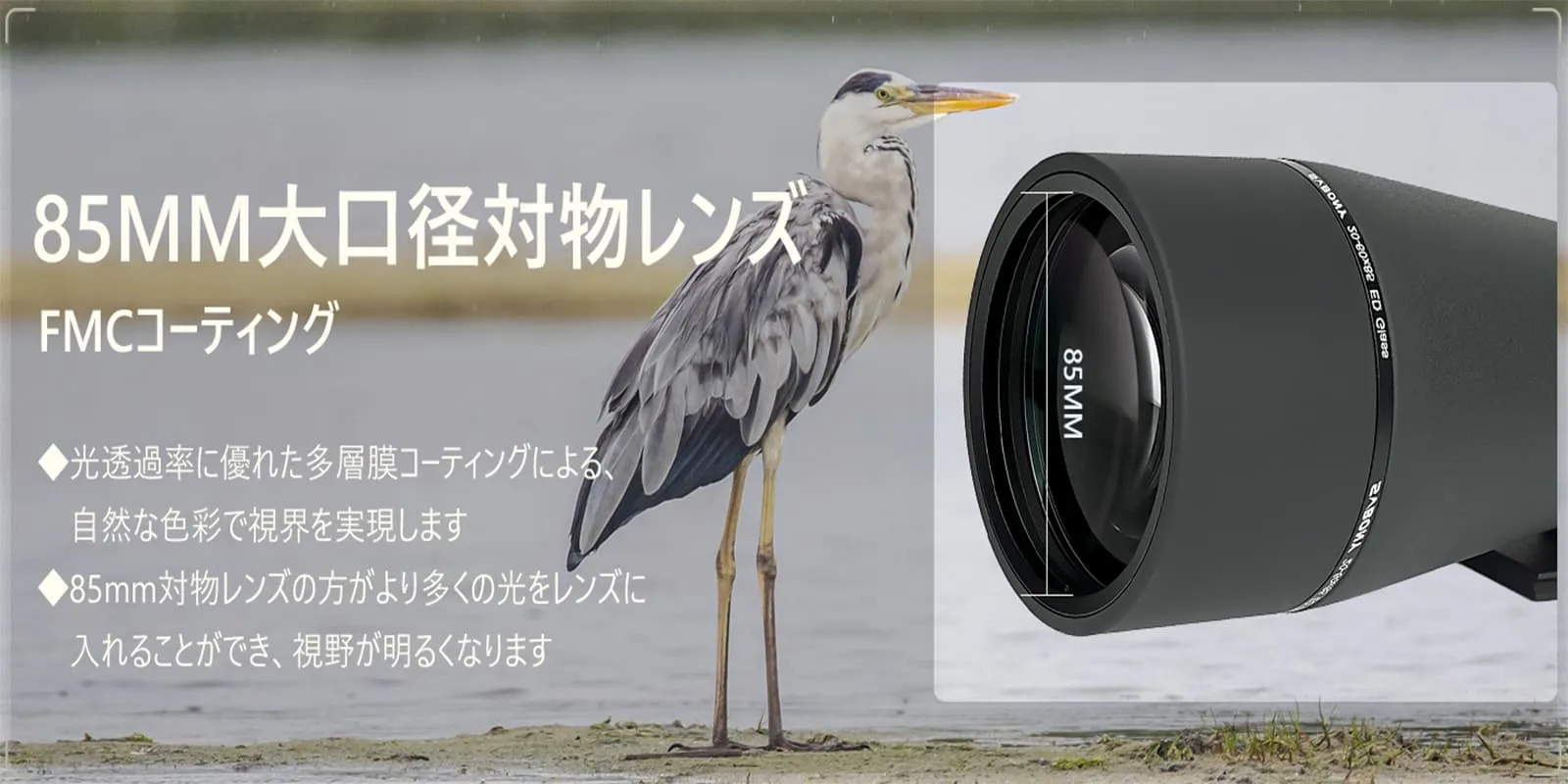 85mm対物レンズはより多くの光を集め、視野が明るくなります。