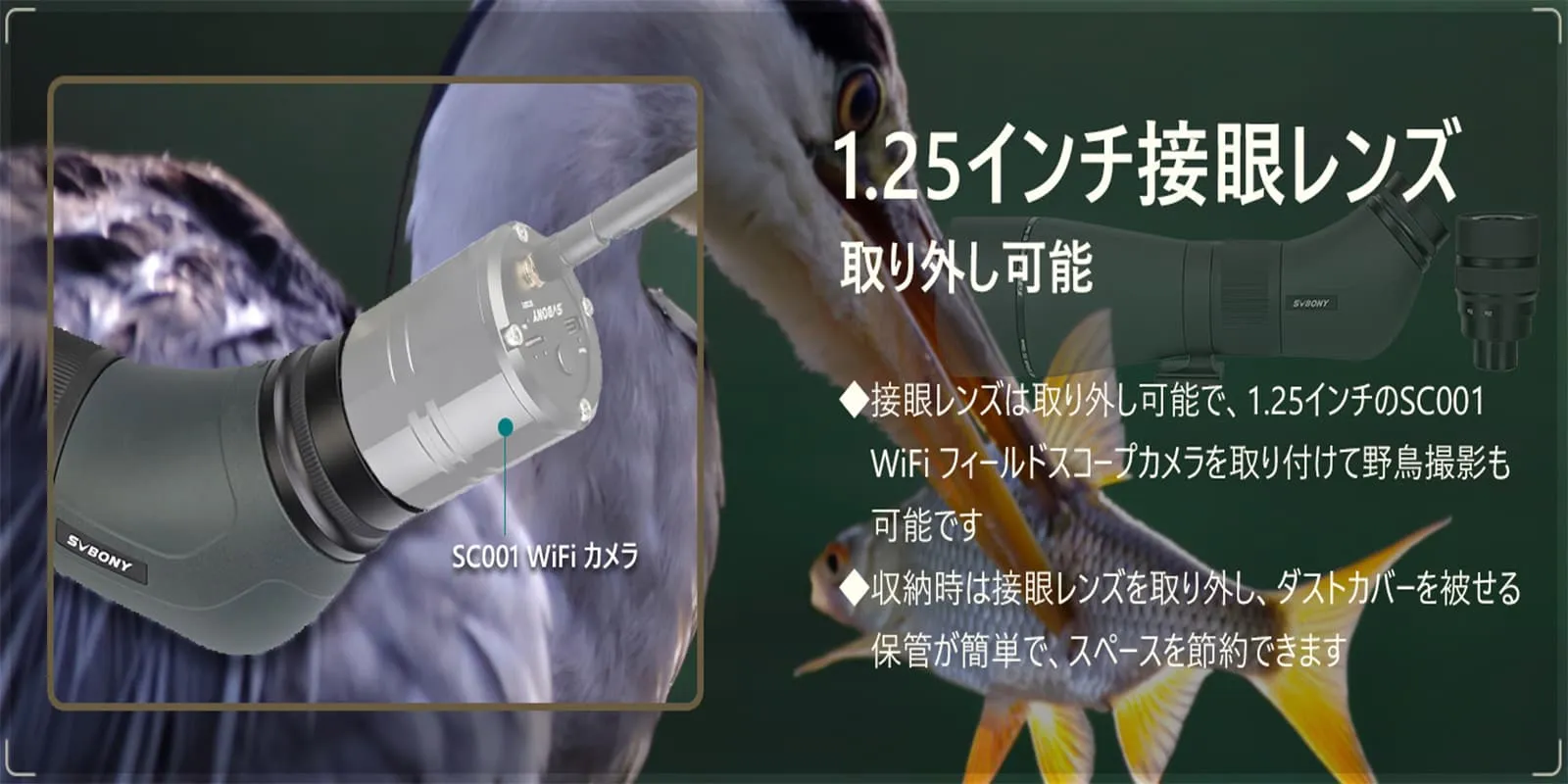 2.接眼レンズの取り外しが可能で、当社のWI-FIカメラにも対応可能です。スマホ連携は出かけた先で撮った写真を即座にSNSにシェアできる便利なアイテムです。