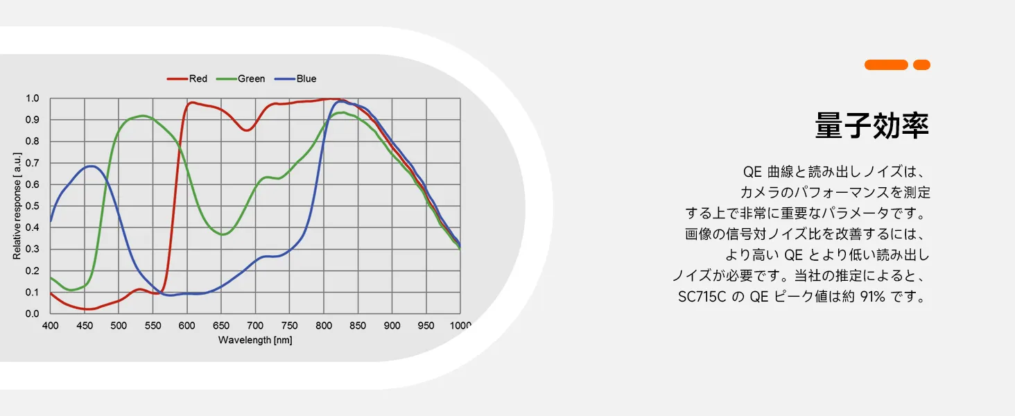 一般的なカメラの QE は通常 30% ~ 60% です。ハイエンド天体カメラのQEは通常が80%以上です。 SC715C の QE は 91% に達し、露光時間を効果的に短縮し、観察効率を向上させることができます。