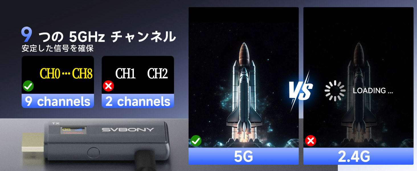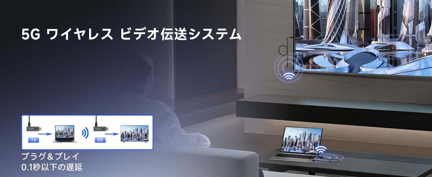 2、50〜80mの超長距離無線安定伝送: 5GHzチップセットを搭載したこのデバイスは、強力な浸透力で安定した高速信号伝送を実現します。HDMI信号を無線で、壁越しでも、最大50mまでの超遠距離を伝送可能です。