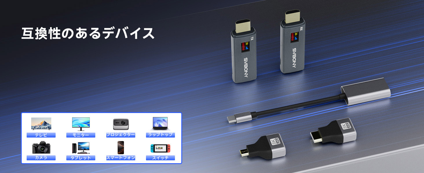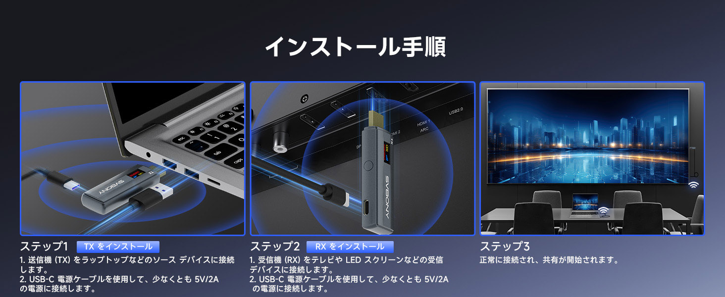 挿すだけ使える:送信機(TX)をPC/ノートパソコンのHDMIポートに接続し、受信機(RX)をHDTV/プロジェクター/モニターのHDMIポートに接続するだけです。