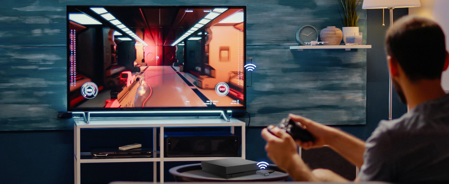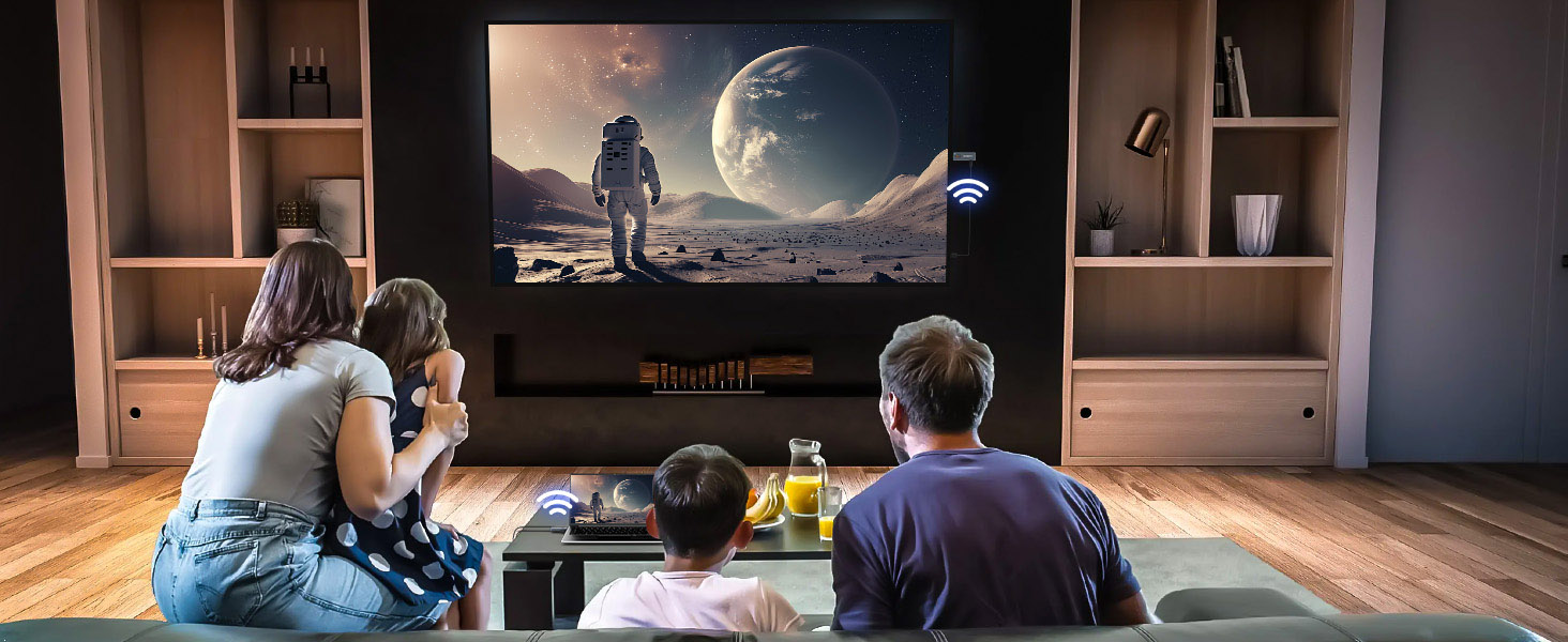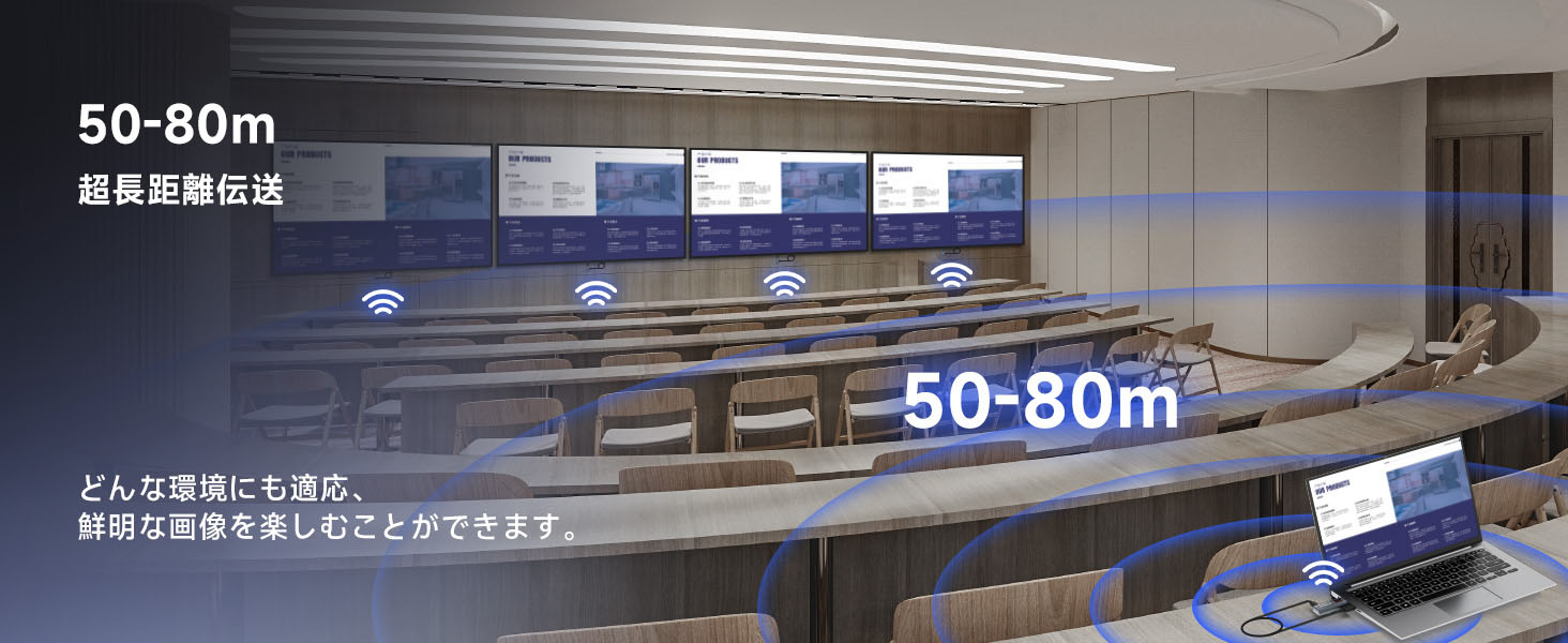 50~80m距離無線安定伝送: 従来のケーブルタイプのようにテレビの傍に置く必要はありません。テレビから離れて端末を操作しながらワイヤレスで画面投影できます。