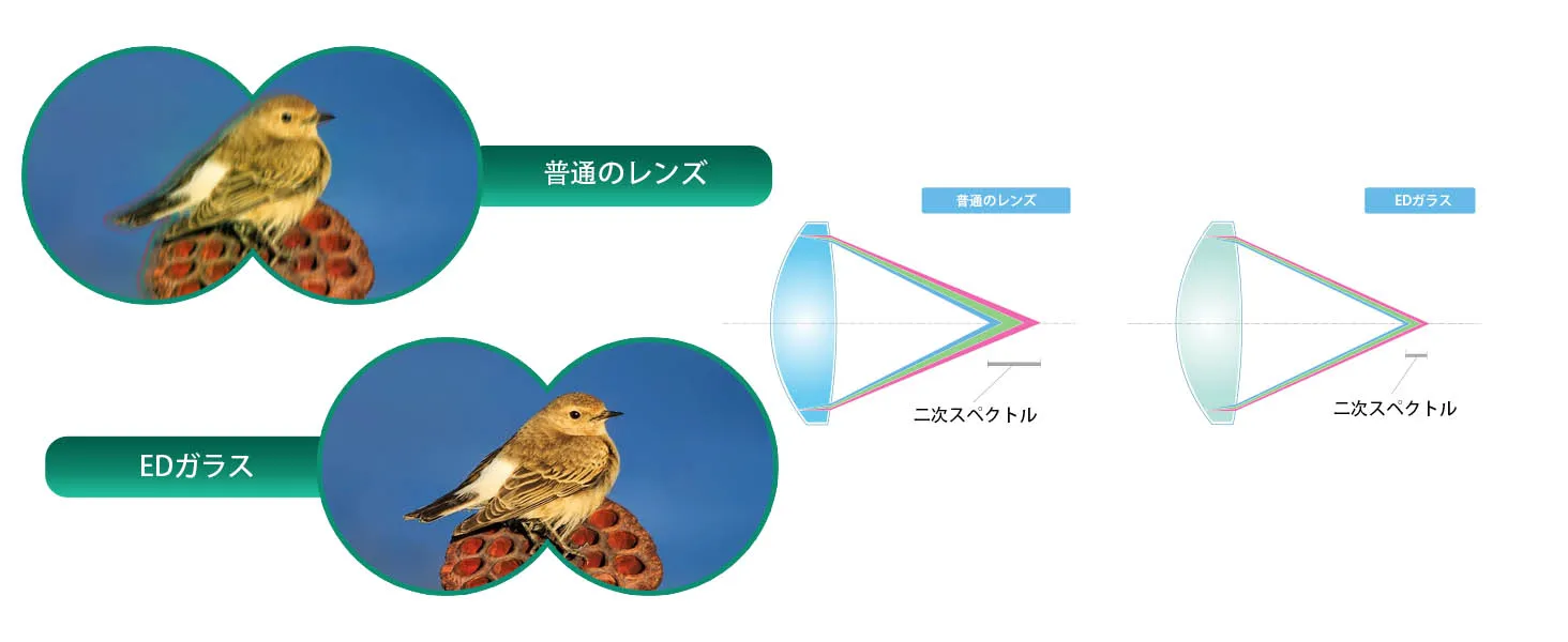 SV202双眼鏡は超低分散EDレンズを採用しています。ED レンズは、その特徴であるカラーフリンジを実質的に排除します。特に暗い場所では違いが顕著ですので、夕暮れや夜明けの観察にはSV202双眼鏡をご使用ください。