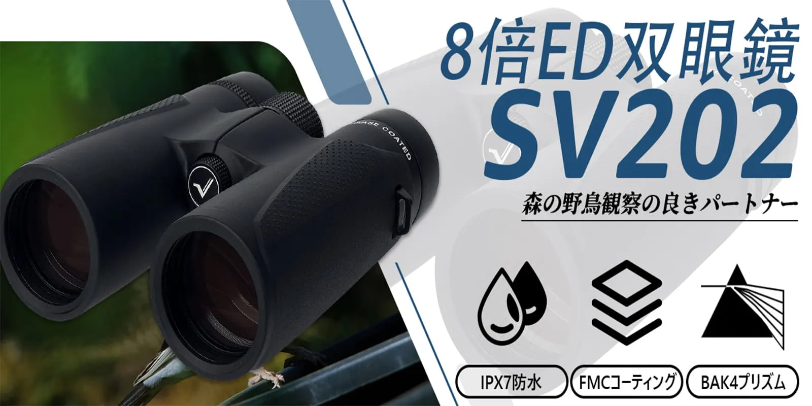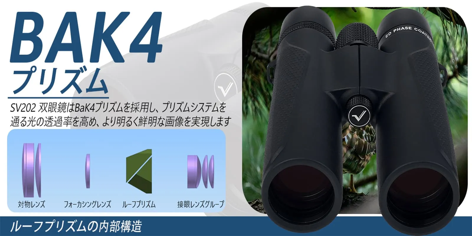 SV202 双眼鏡はBaK4プリズムを採用して、視野周辺までより明るく鮮明な画像を実現します。