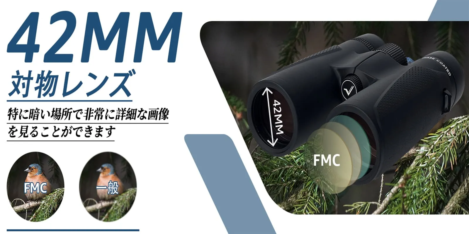 倍率8倍、42mmの大型対物レンズ、大型接眼レンズで明るく鮮明な画像が得られ、鳥の羽の細部まではっきりと見ることができ、森の野鳥観察に適しています。
