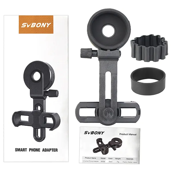 SV218 スマホアダプターは双眼鏡、単眼鏡、フィールドスコープ、顕微鏡、天体望遠鏡と互換性があります。 接眼レンズサイズは 26~43mmに適合します。