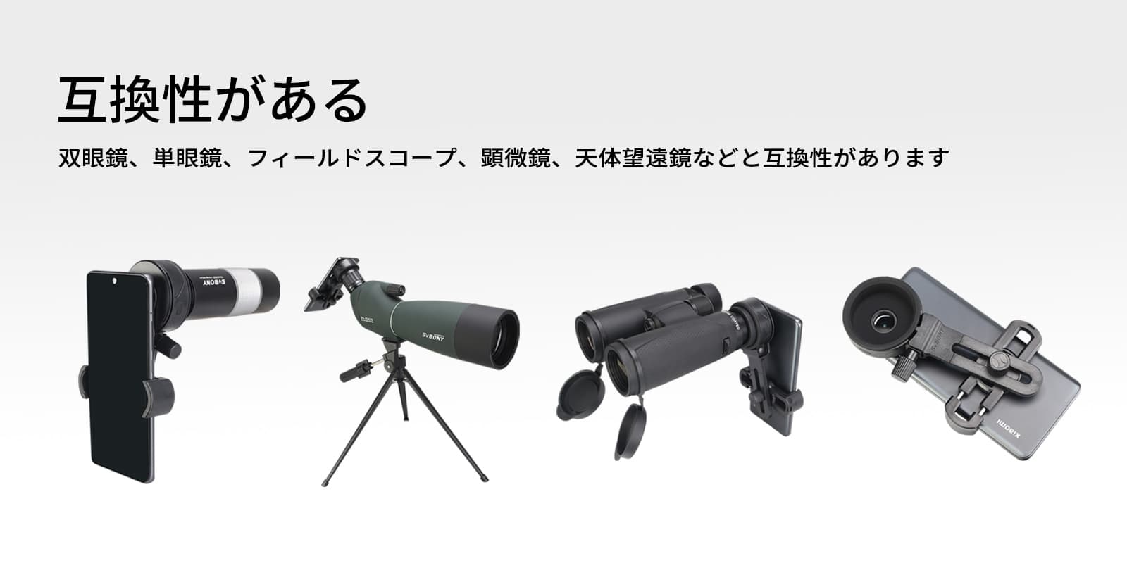 双眼鏡、単眼鏡、フィールドスコープ、顕微鏡、天体望遠鏡等と互換性があります。観測や撮影のニーズを満たすことができます。