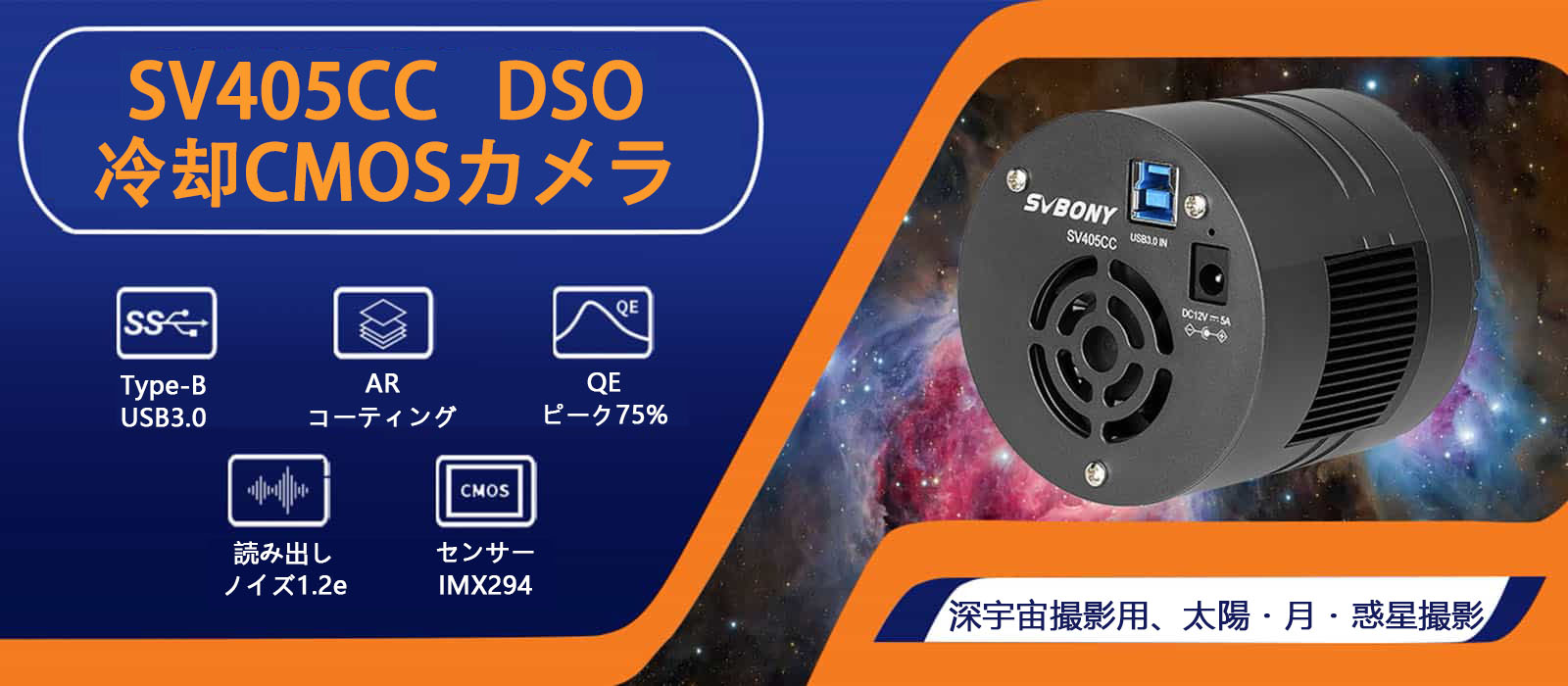 1.SV405CC天文カメラは、量子効率が高く(ピークQEが75%を超えると推定される)裏面照射型センサーIMX294センサーを採用し、感度を向上させ、ノイズを低減しています。SV405CCは、SONY製IMX294センサーを搭載したカラーCMOSカメラです。天体撮影用CMOSカメラの主流です。非常に低いリードノイズ(1.2e-)と高いFullWellキャパシティー(63ke)の高性能センサーから生まれる広いダイナミックレンジを持つC-MOSを採用します。1ピクセルが4.63μmの大きなピクセルピッチを採用しており、非常に高い感度とダイナミックレンジを有する天文カメラです。天体撮影用の高感度カラーCMOSカメラです。冷却ができる高画質の天体写真カメラです。