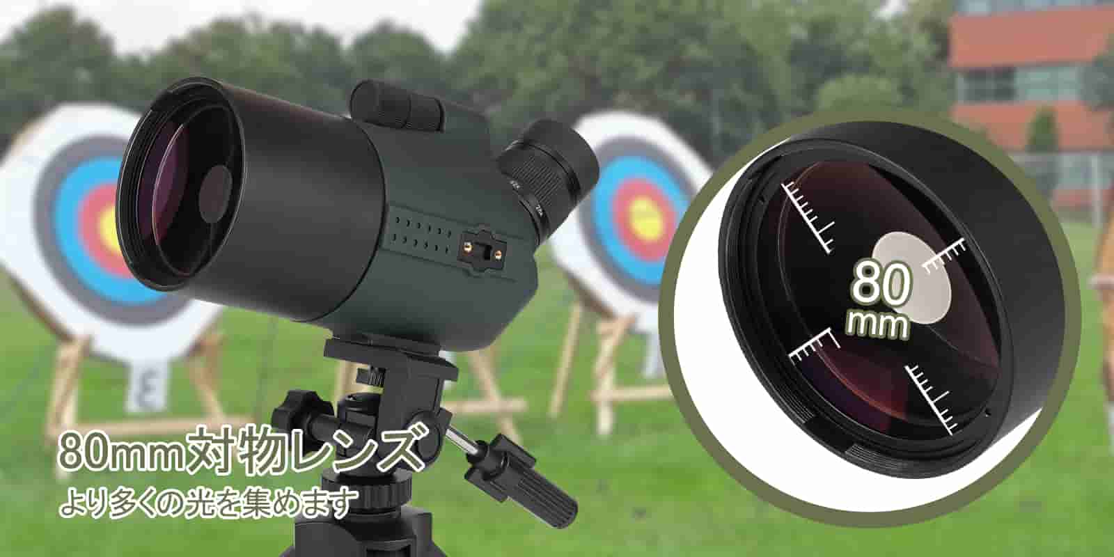 - 【80mm対物レンズ】対物レンズに入射する光の量が増え、集光力が強くなり、 より鮮明で高解像度の画像が得られます。