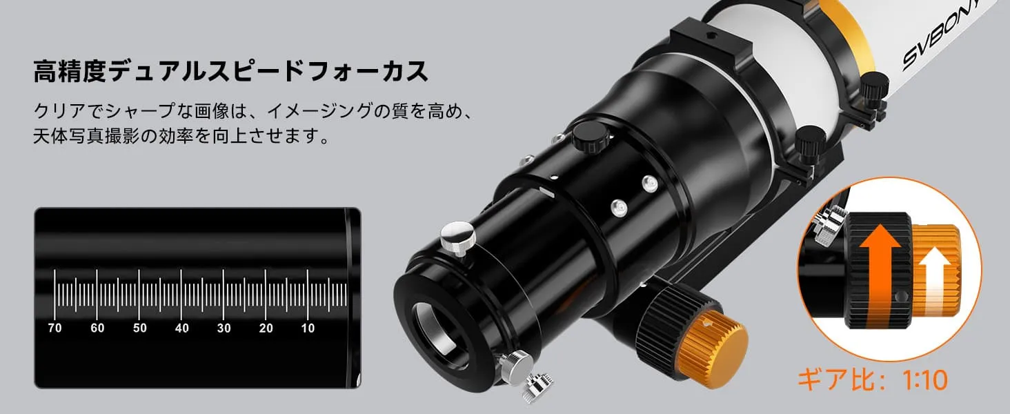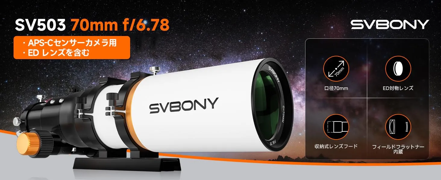 f/6.78と70mmの口径を持つSV503屈折望遠鏡は、銀河、星雲、星団などの明るく鮮明な画像を提供します。