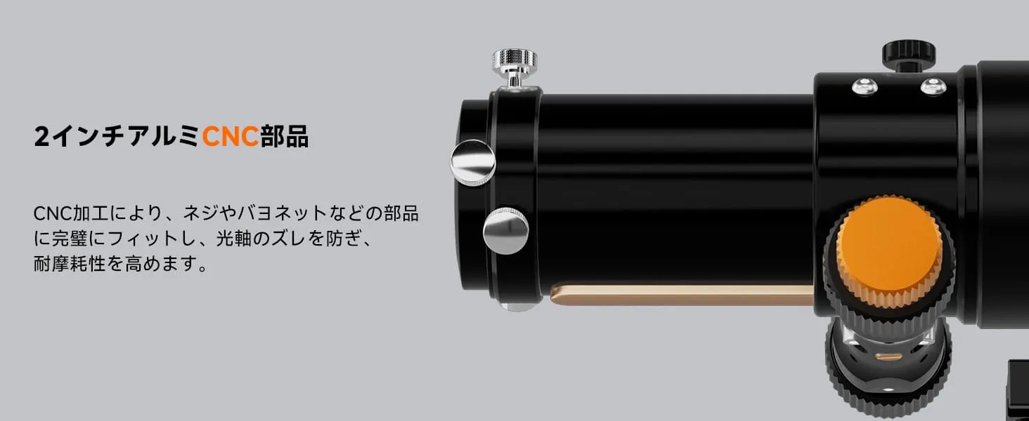 デュアルスピードフォーカサー。粗動(高速)と微動(低速)の2つのスピードでピント調整ができます。減速比は約1:10で、微細なピント合わせが必要な天体写真撮影や高倍率観測時に役立ちます。