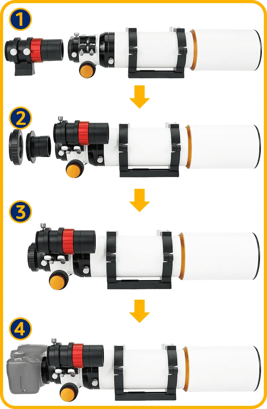 本体に採用されているデュアルフォーカサーは減速比1:10で、微細なフォーカス合わせが出来ます。また、接眼部の繰り出しは精密ラック&ピニオン方式で、重量のある機材を装着した際の緩みやズレを防止出来ます。更に、接眼部全体を回転させる回転機能があります。この回転機能を使えばファインダーを見やすい場所に移動・調整可能で、天体写真撮影の際の縦横の切替がよりスムーズに出来るようになります。アダプターは2インチスリーブと1.25インチスリーブの変換アダプタ2個が付属します。