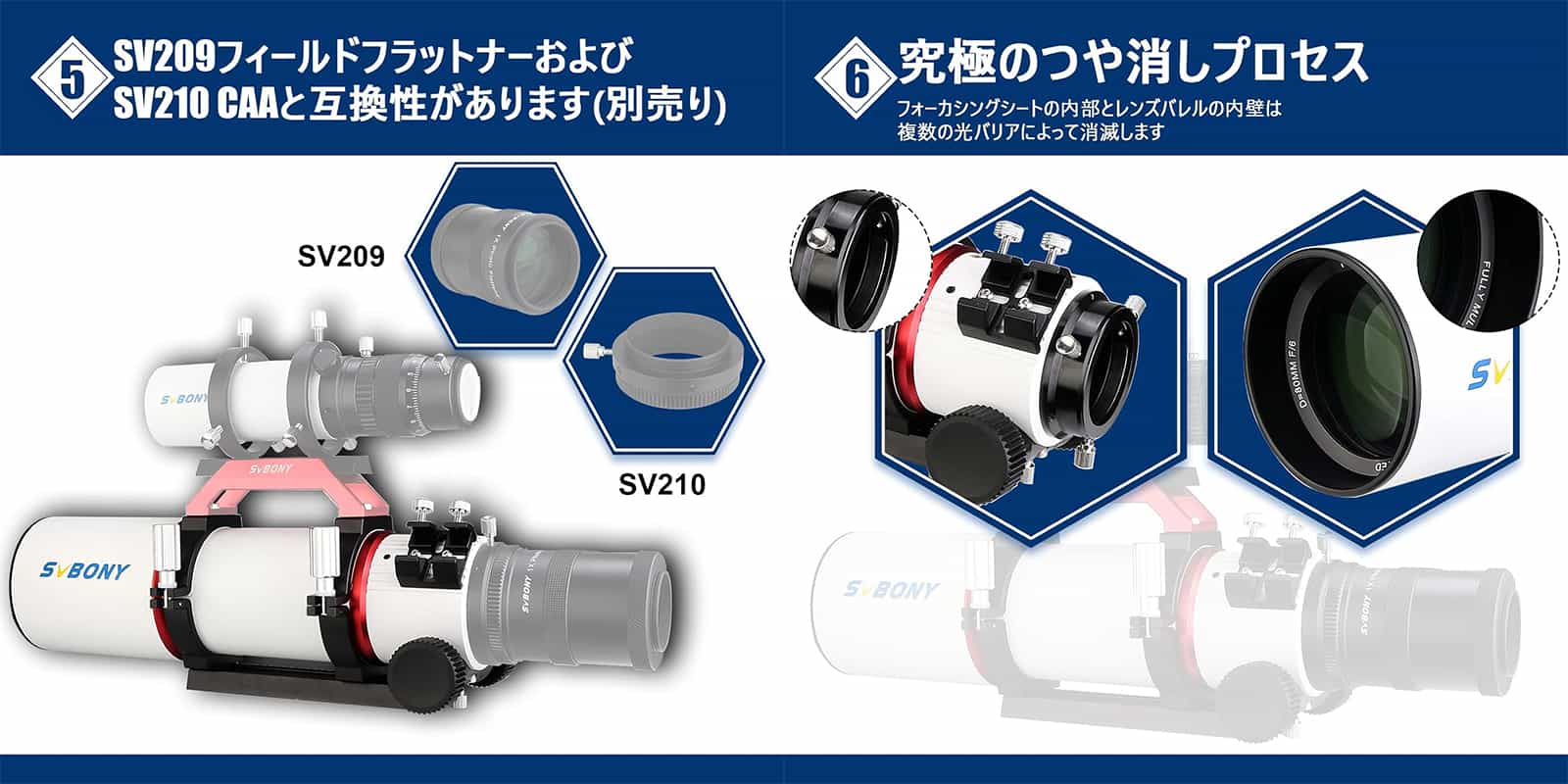 1.SVBONY SV209「等倍1.0Xフラットナー」は、SV503 APO鏡筒専用に設計と製作なので、鏡筒との相性がより良く、鏡筒側は M63x1おねじで取付けます。2群2枚構成(全面マルチコーテッド)を処理実施します。